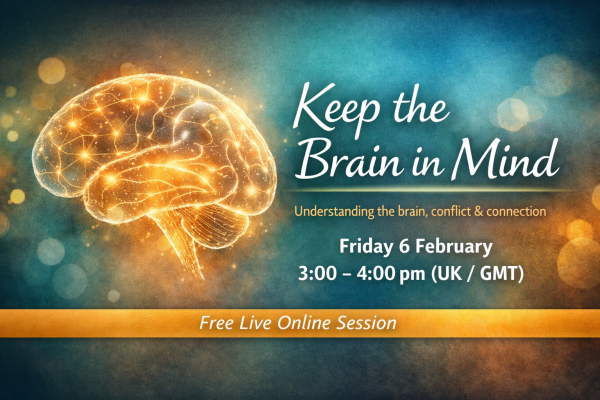 Horizontal event thumbnail showing a glowing illustrated brain on a teal and gold background with the text: “Keep the Brain in Mind – Understanding the brain, conflict & connection. Friday 6 February, 3:00–4:00 pm (UK / GMT). Free live online session.”